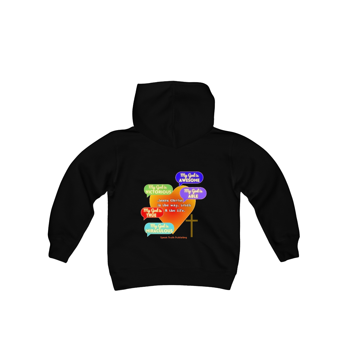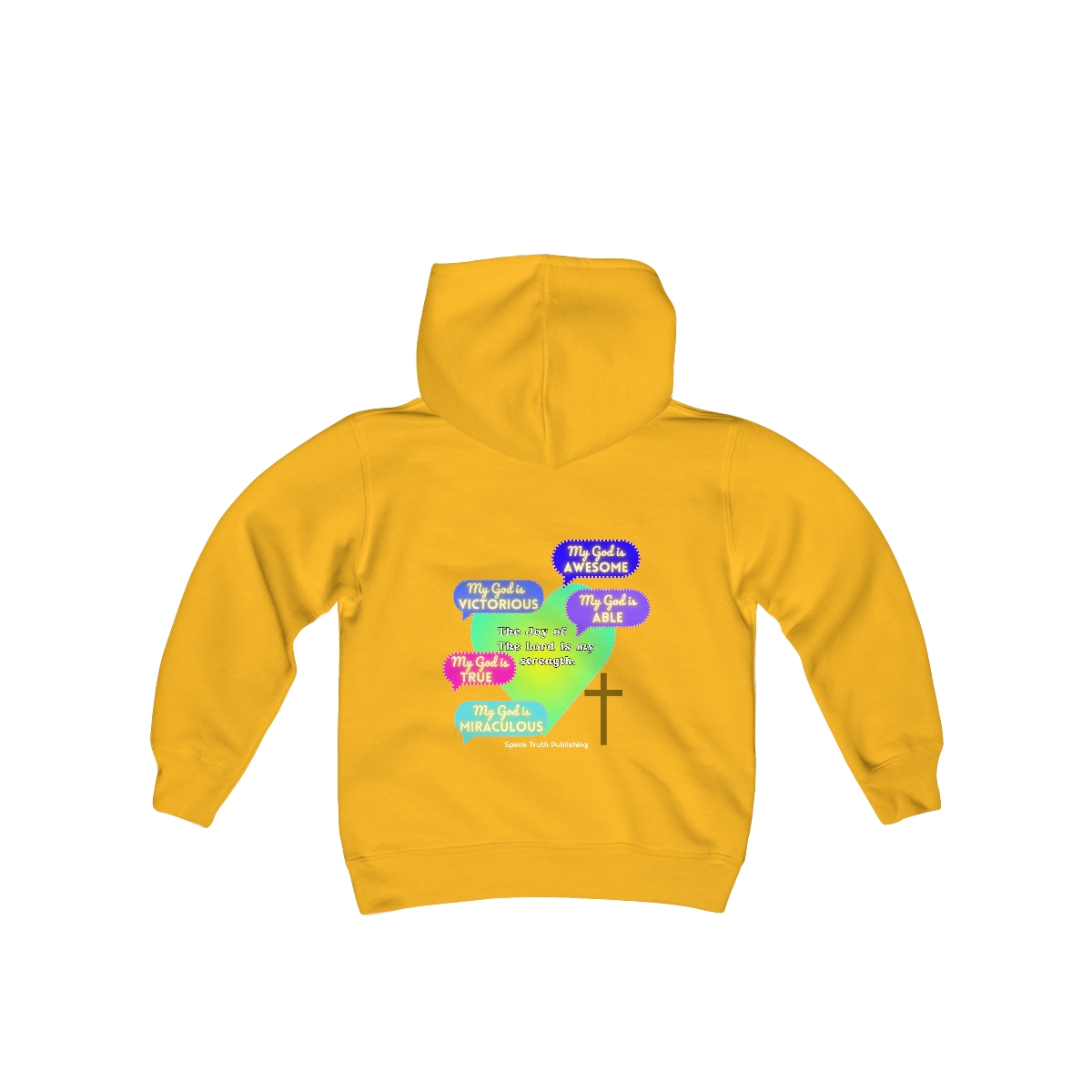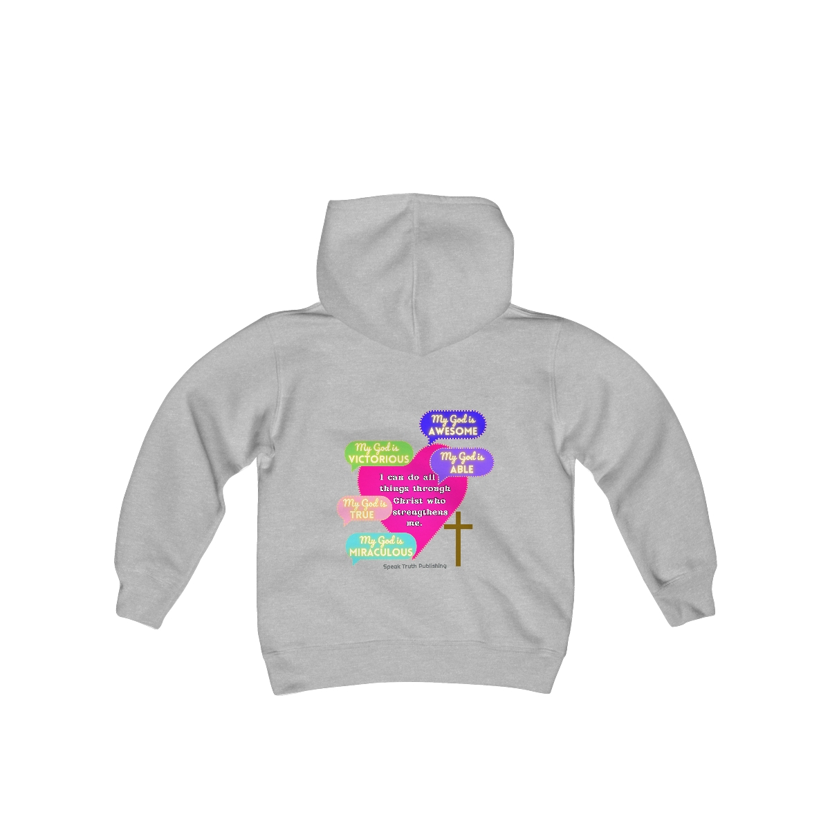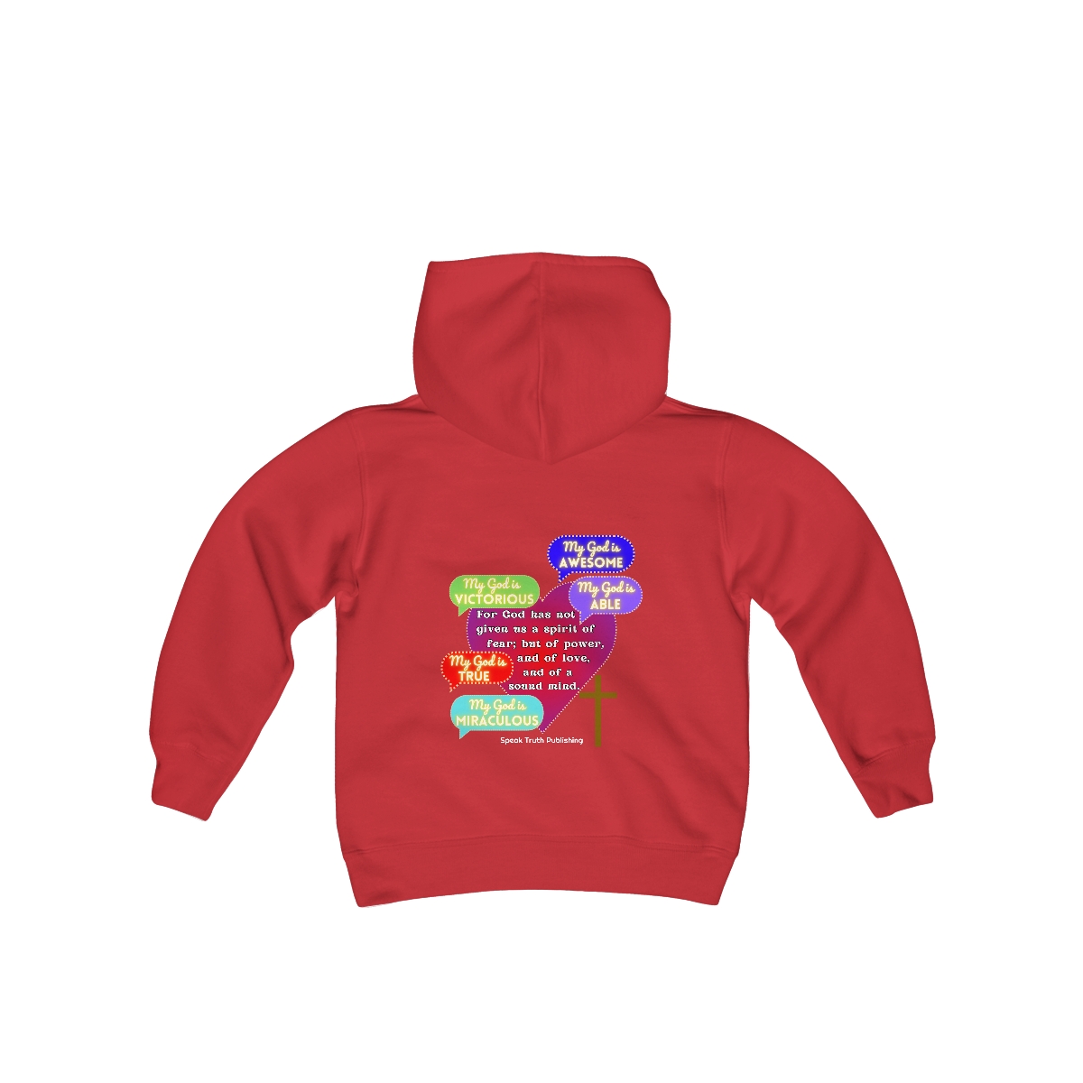 My Superhero Is God hooded sweatshirts are made specifically for the Youth–Yup that’s right. They are made of ultra-soft, preshrunk fleece that feels wonderful against the skin and runs true to size. The garments are 50% cotton 50% polyester with reduced lint buildup  (fiber content may vary for different colors). The front has a kangaroo pocket big enough for both hands. The back has a powerful scripture, making it a perfect declaration. Please note that each color sweatshirt has a different scripture on the back. Thank you for the support. May each child remeber The True Superhero!