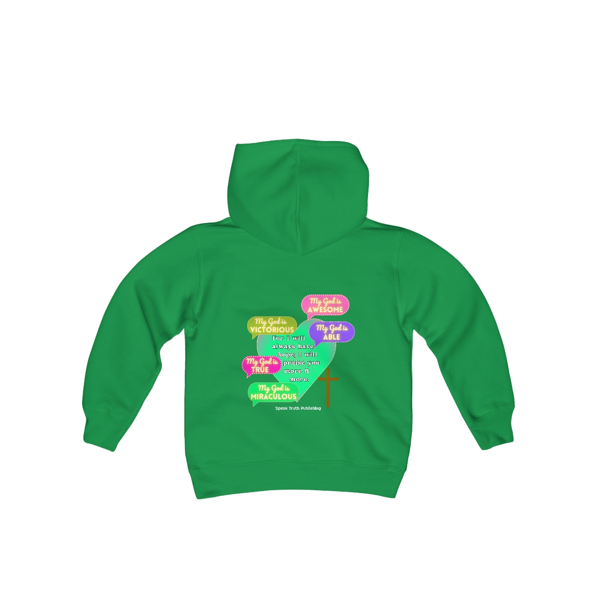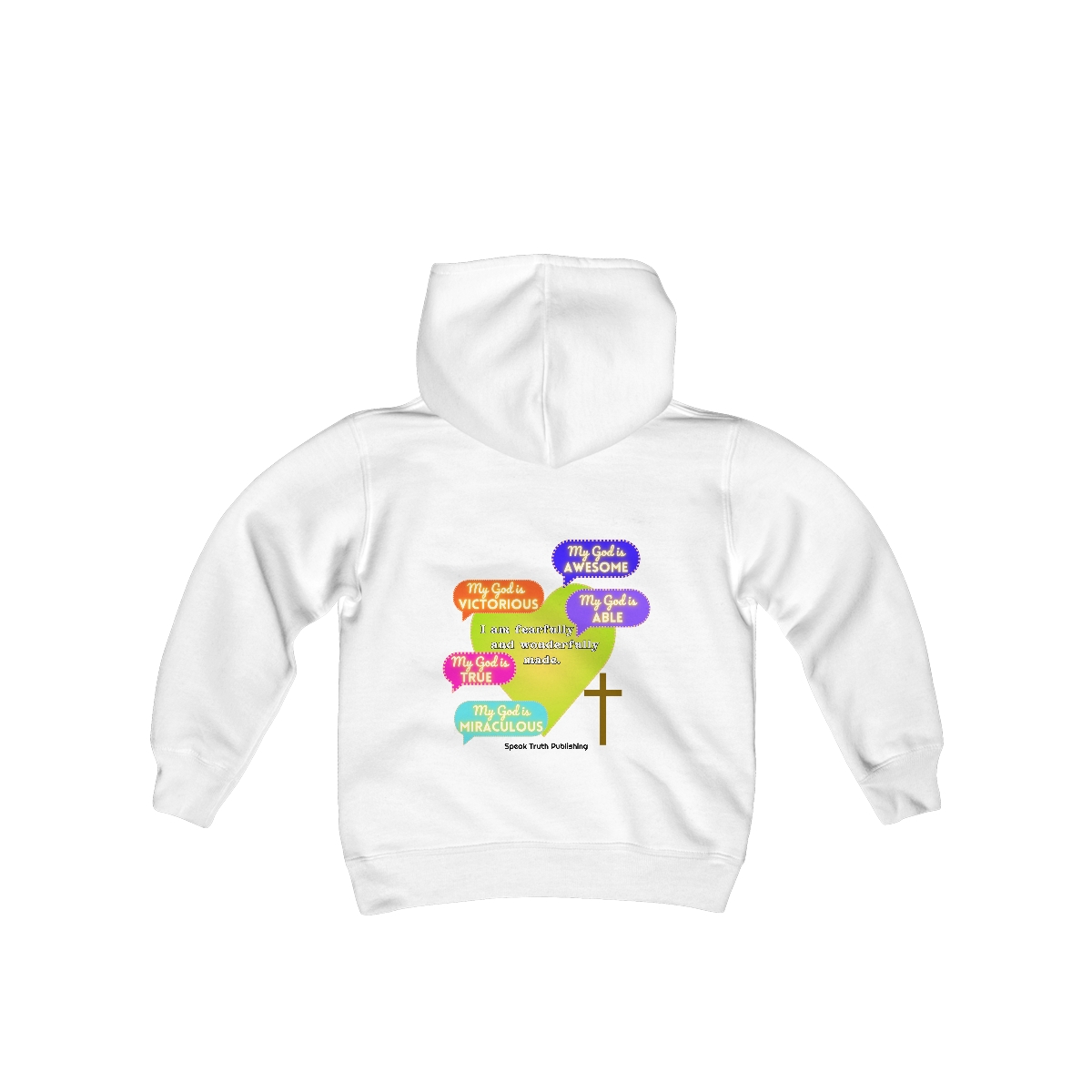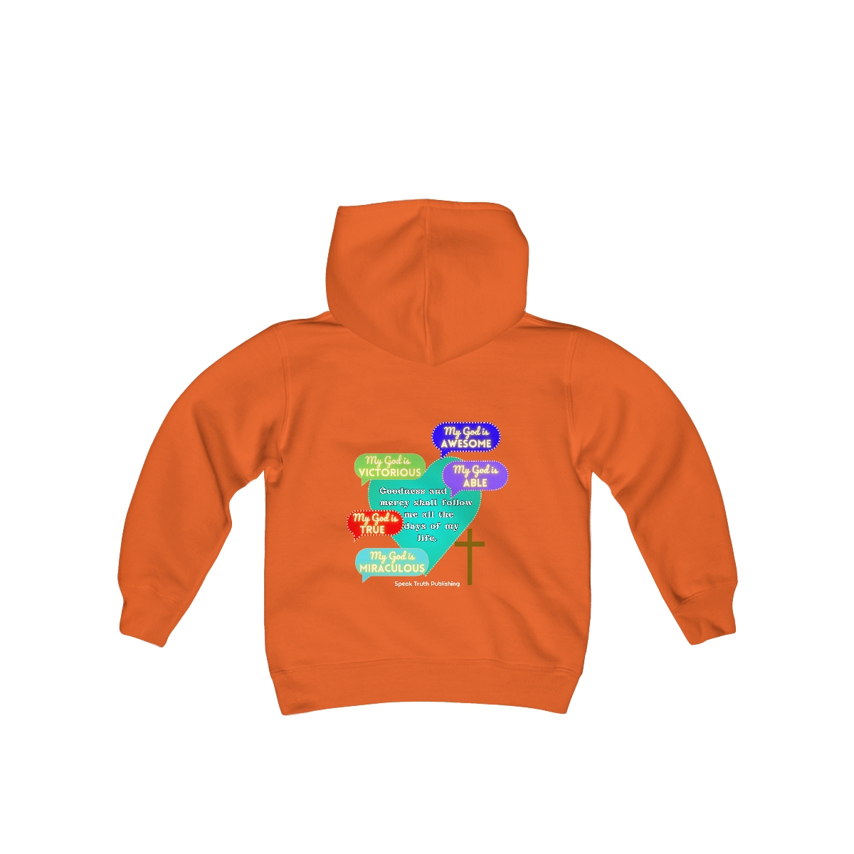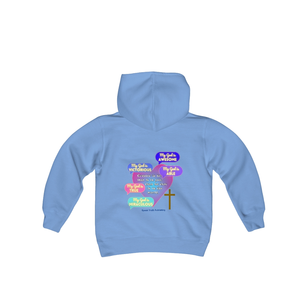 My Superhero Is God hooded sweatshirts are made specifically for the Youth–Yup that’s right. They are made of ultra-soft, preshrunk fleece that feels wonderful against the skin and runs true to size. The garments are 50% cotton 50% polyester with reduced lint buildup  (fiber content may vary for different colors). The front has a kangaroo pocket big enough for both hands. The back has a powerful scripture, making it a perfect declaration. Please note that each color sweatshirt has a different scripture on the back. Thank you for the support. May each child remeber The True Superhero!
