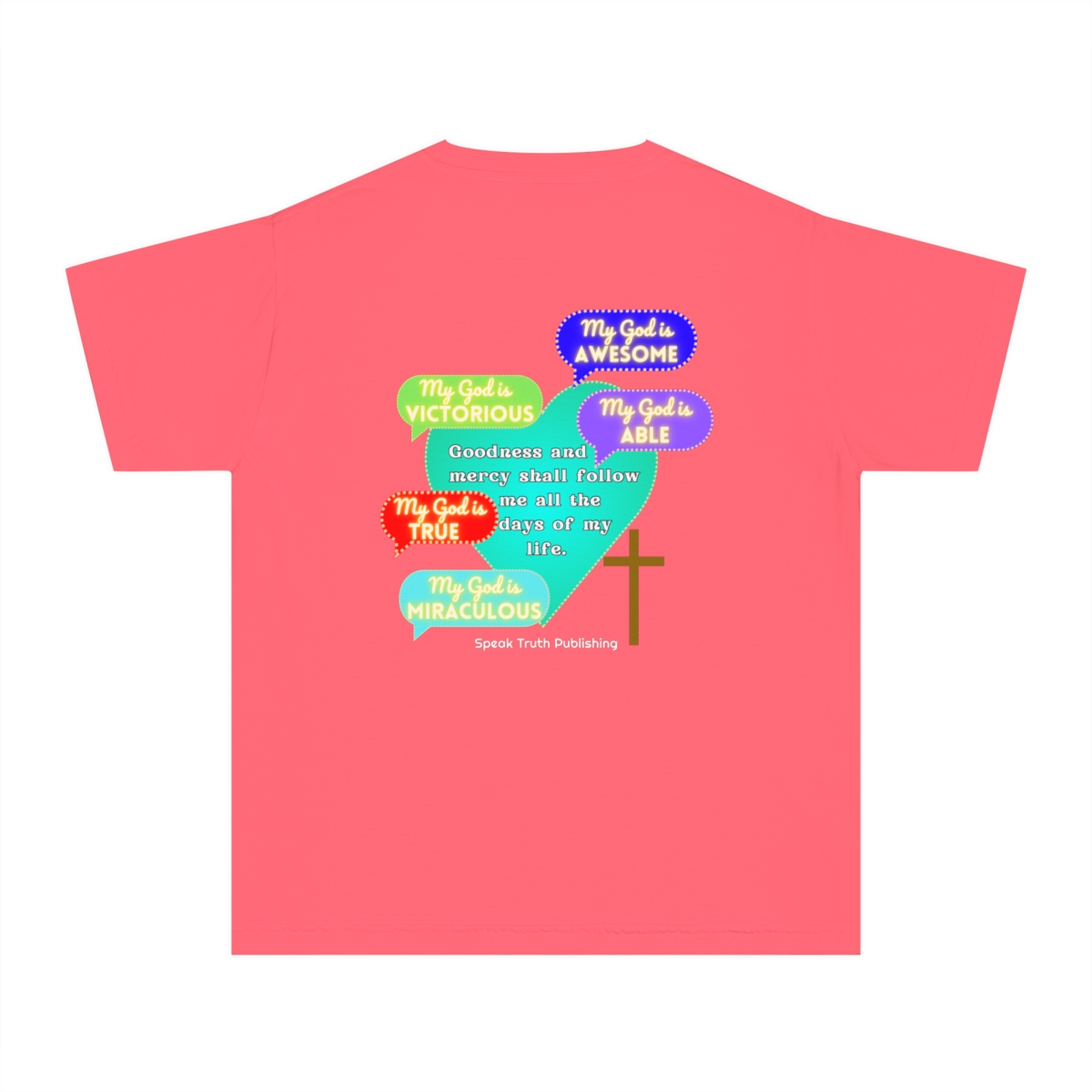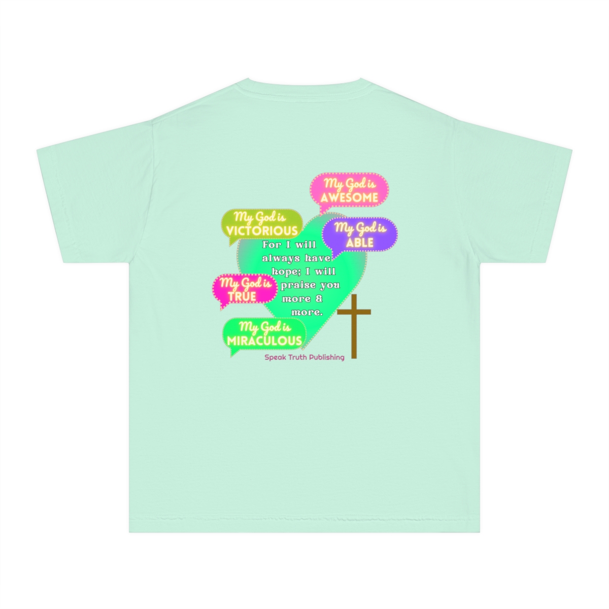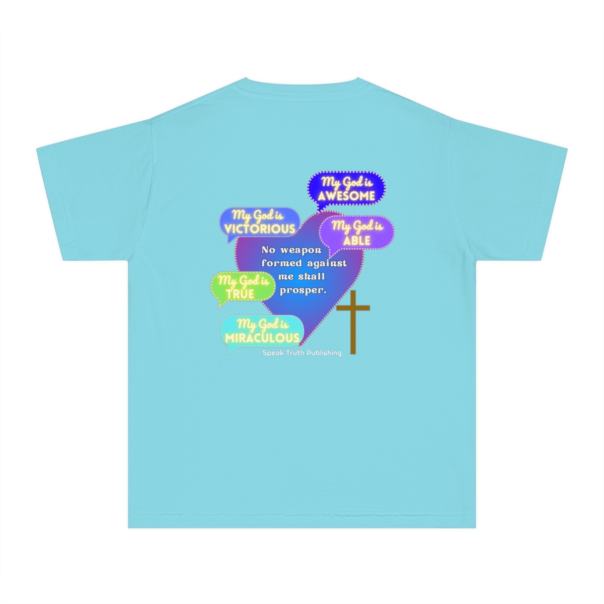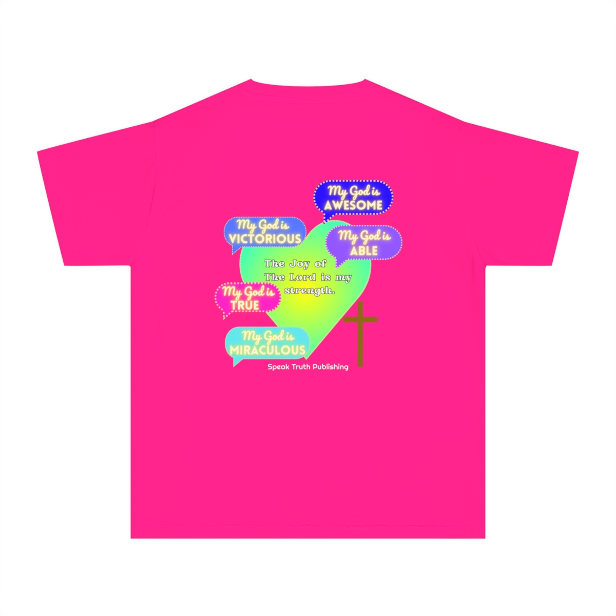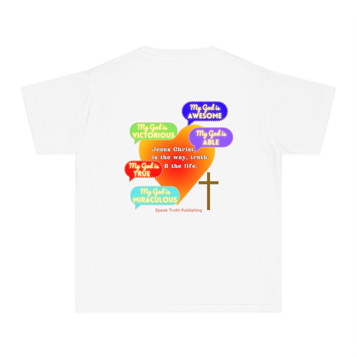 My Superhero Is God Tees are specifically for The Youth! They are vibrant in color and have a slamming statement on the back. These classic fit tees are blended with both comfort and agility, making it suitable for any child’s day-long wear..Yup that’s right. Made with 100% combed ring-spun cotton, the fabric is light, soft-washed and garment-dyed. May God’s Children be encouraged in the fact that Jesus is indeed The True Superhero.